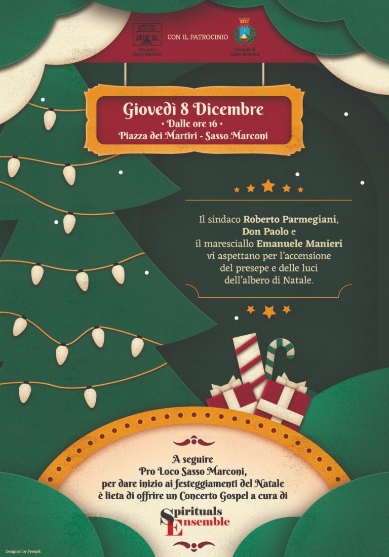 Dopo l’accensione delle luminarie lungo le strade di Sasso Marconi avvenuto il 30 novembre, grazie al prezioso contributo dei commercianti, al sostegno di aziende, attività produttive, associazioni e privati cittadini, giovedì 8 dicembre dalle ore 16:00 in Piazza dei Martiri, il sindaco Roberto Parmeggiani, il parroco don Paolo Russo e il comandante della locale stazione carabinieri Emanuele Manieri, vi aspettano per l’accensione del presepe e delle luci dell’albero di Natale.