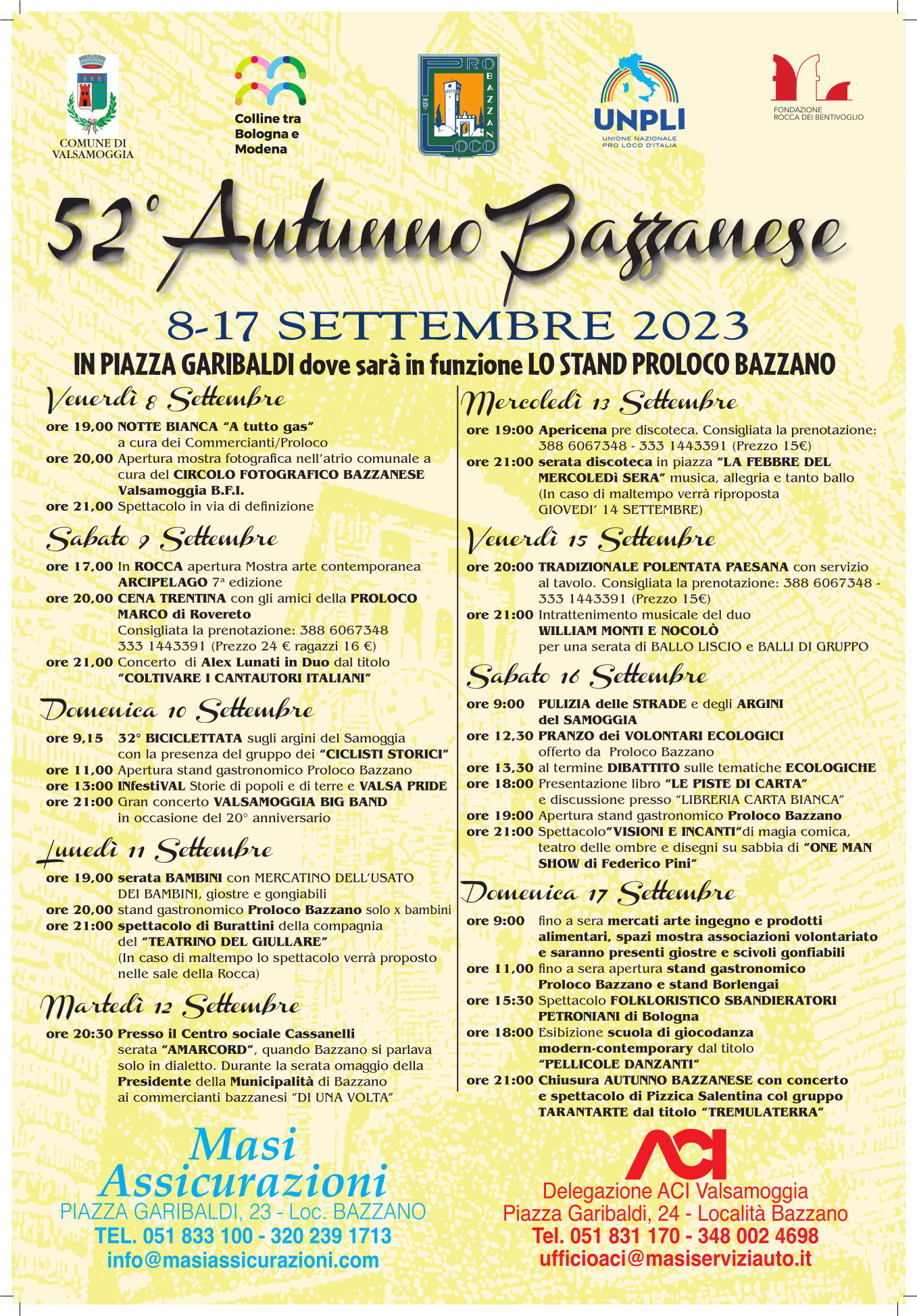 Dall'8 al 17 Settembre 2023, a Bazzano ritorna il tradizionale appuntamento con la rassegna di eventi dell'Autunno Bazzanese.