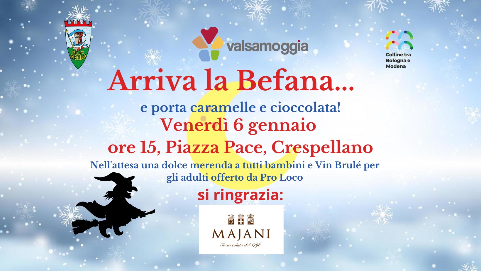 Venerdì 6 Gennaio 2023, alle ore 15.00, in Piazza della Pace a Crespellano (Valsamoggia) ARRIVA LE BEFANA, e porta caramelle e cioccolata.
