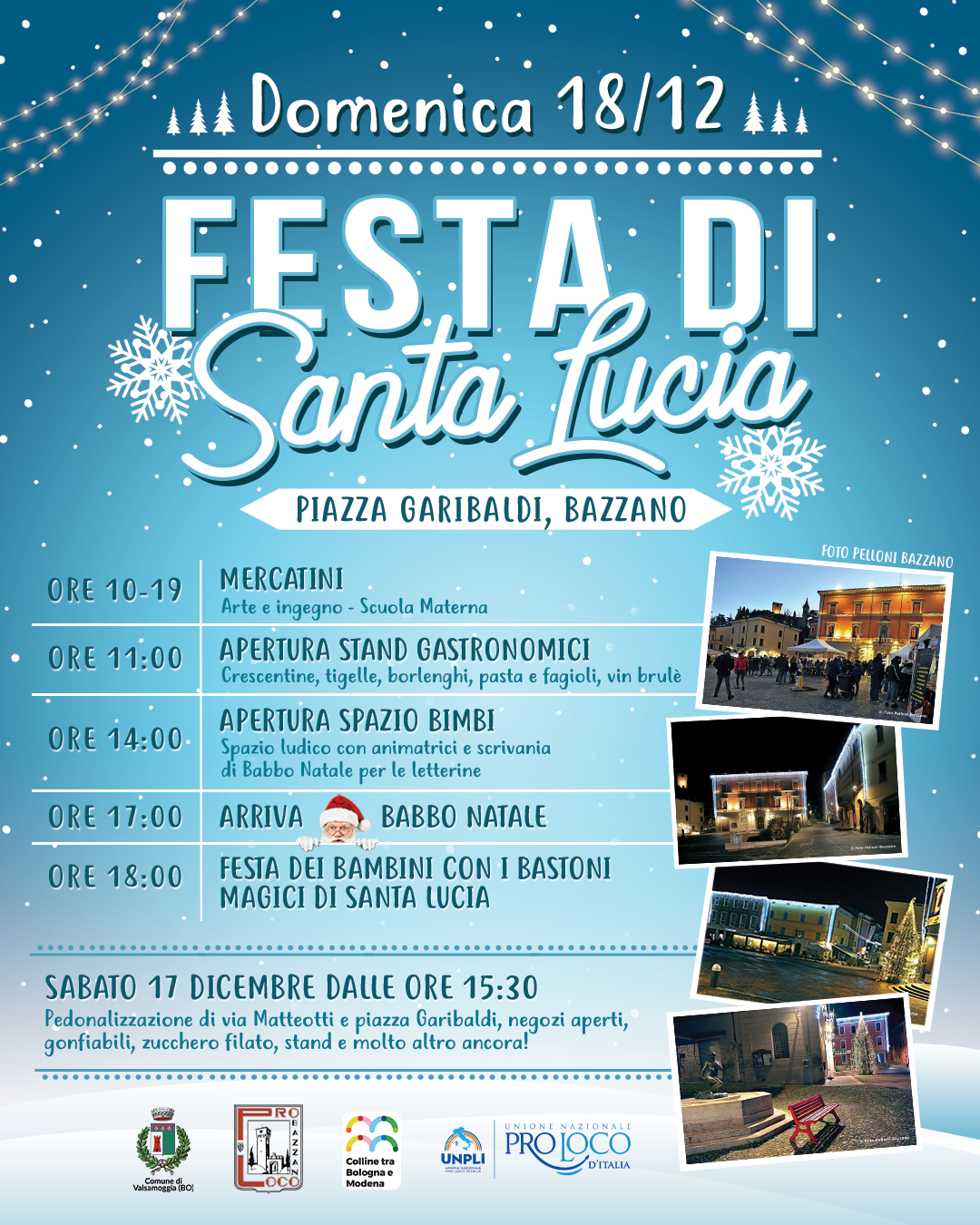 𝐃𝐨𝐦𝐞𝐧𝐢𝐜𝐚 𝟏8 𝐝𝐢𝐜𝐞𝐦𝐛𝐫𝐞 a Bazzano torna uno degli appuntamenti natalizi più amati: 𝐥𝐚 𝐟𝐞𝐬𝐭𝐚 𝐝𝐢 𝐒𝐚𝐧𝐭𝐚 𝐋𝐮𝐜𝐢𝐚!