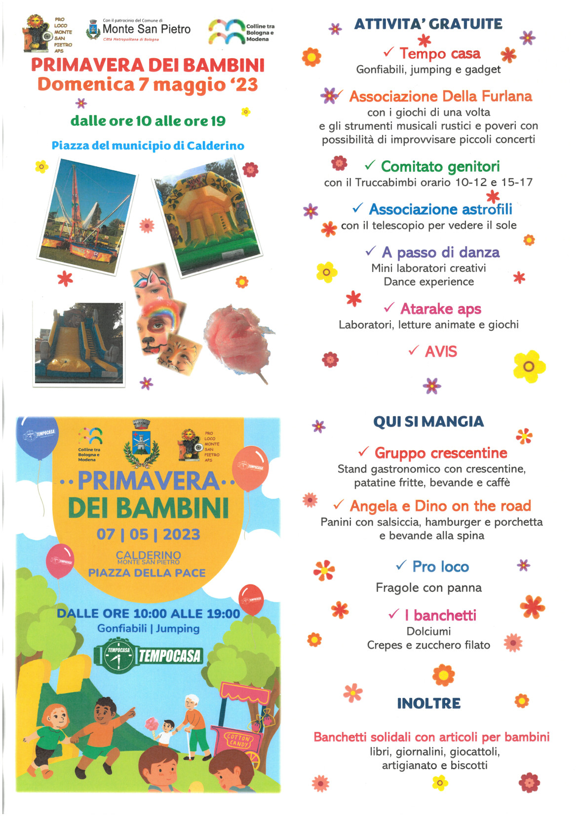 Domenica 7 Maggio, dalle ore 10 alle 19, nella piazza del Municipio a Calderino di (Monte San Pietro) appuntamento con "Primavera dei bambini a Calderino".